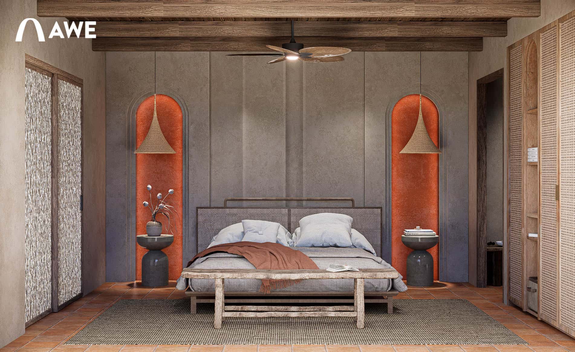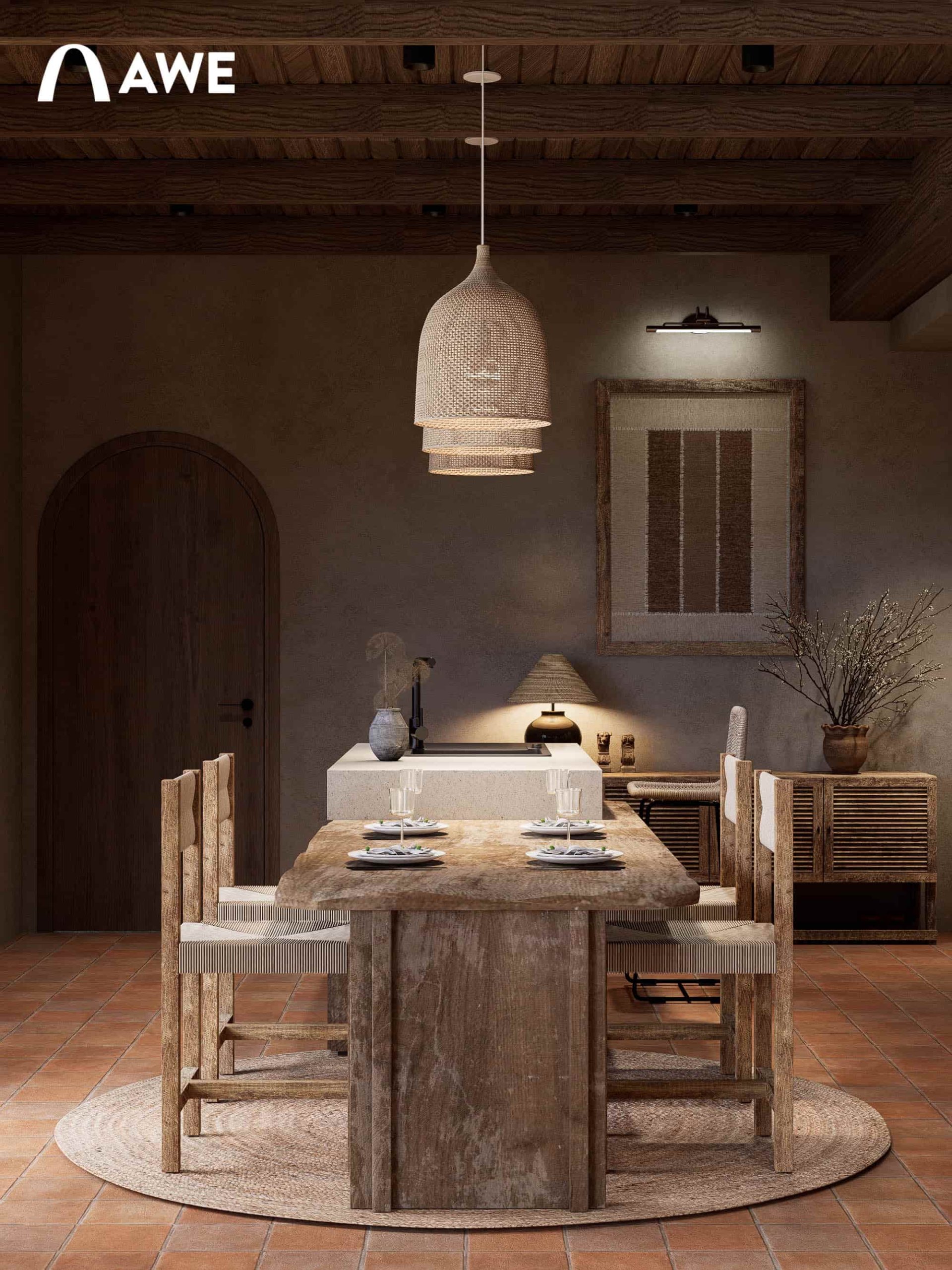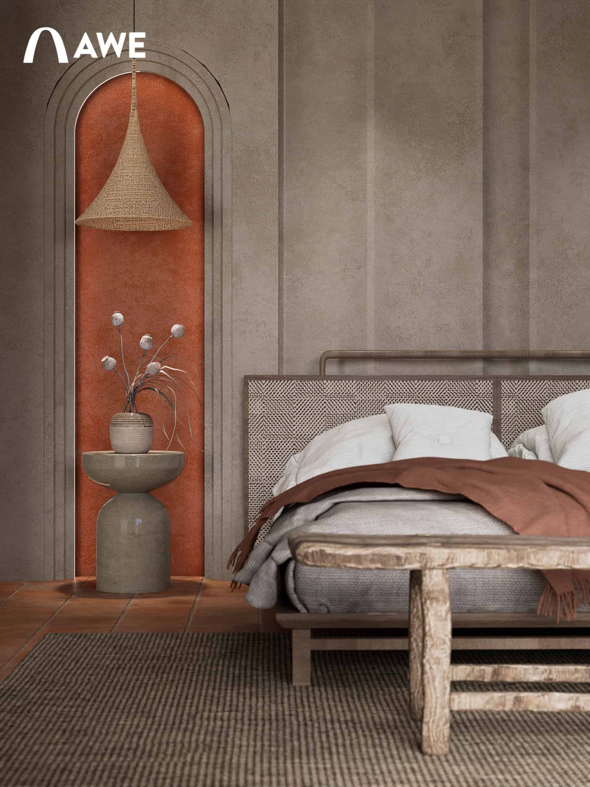 Trong đồ án Thiết kế nội thất Valley Homestay, Hà Vi đã vận dụng kiến thức màu sắc và vật liệu trong việc phối hợp tông màu trung tính như be, xám, nâu, gỗ cùng điểm nhấn Boho như đỏ gạch, vàng mù tạt, cam đất giúp không gian trở nên phóng khoáng mà không làm mất đi sự ấm cúng.
