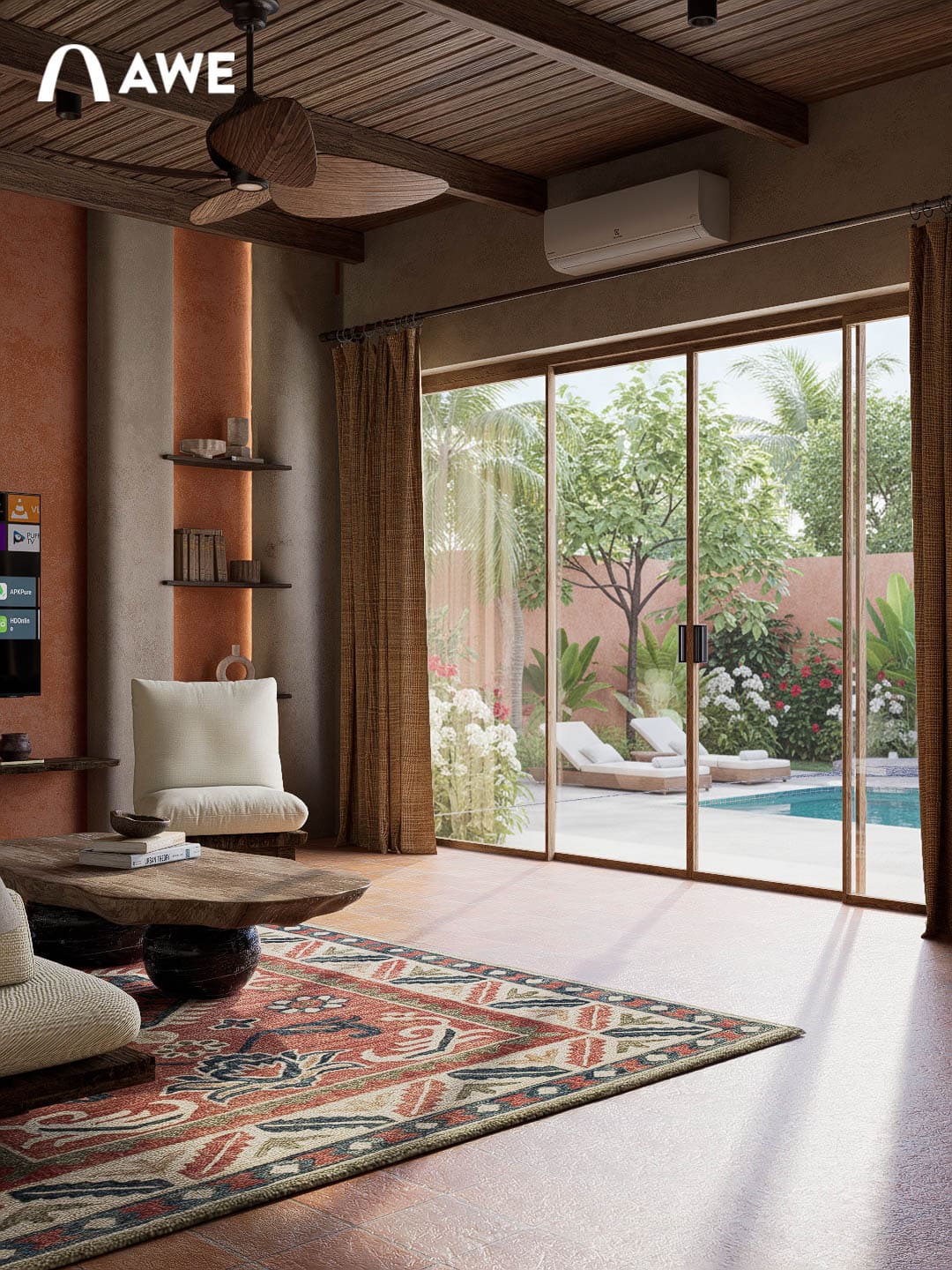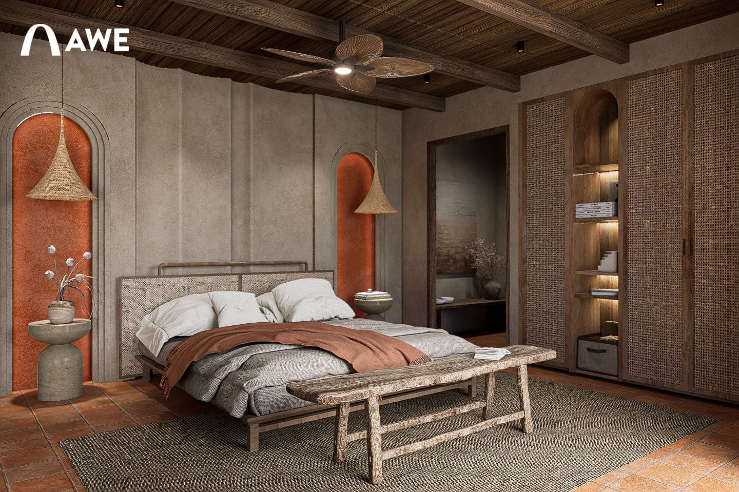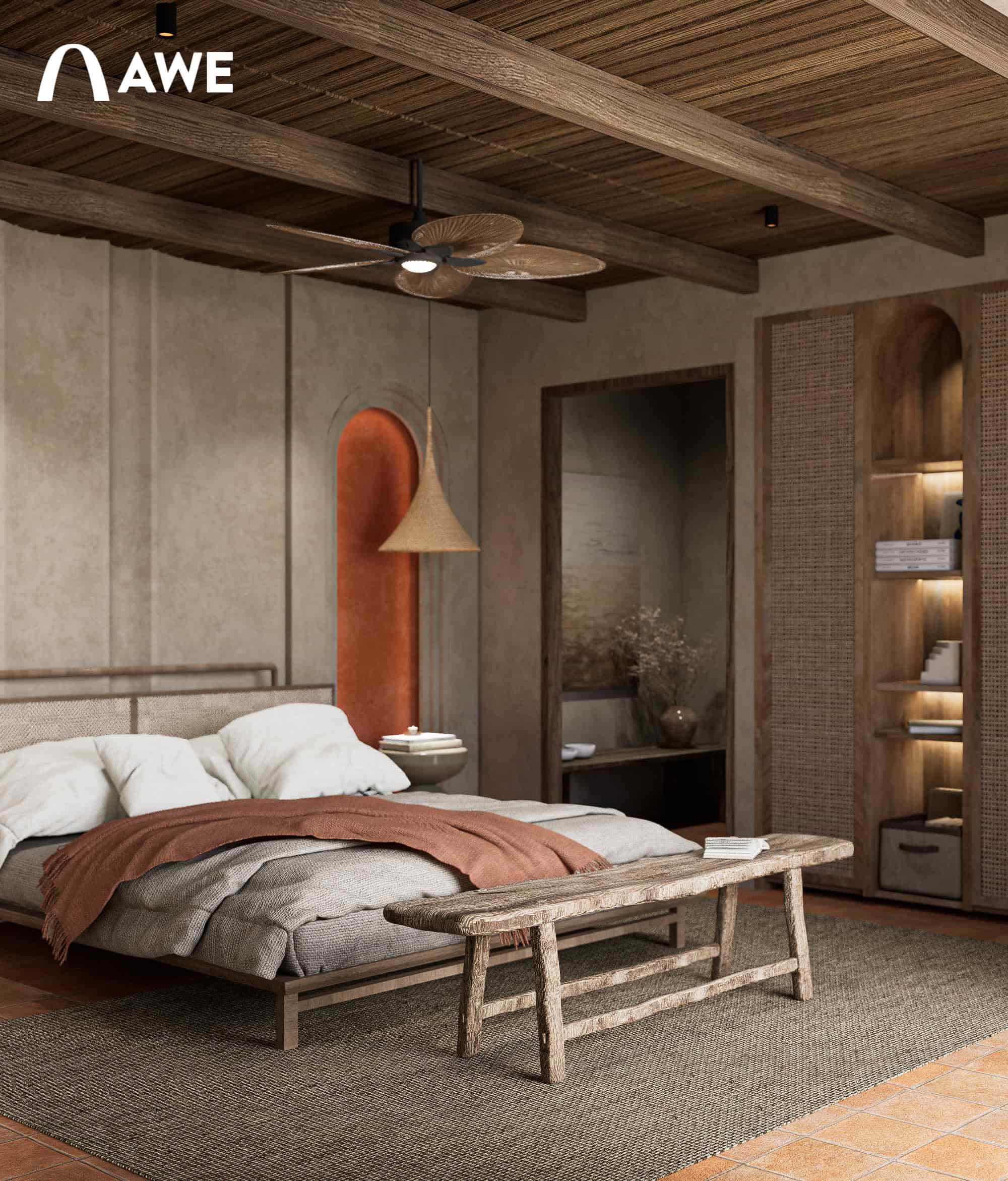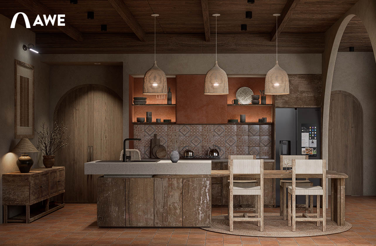 Trong đồ án Thiết kế nội thất Valley Homestay, Hà Vi đã vận dụng kiến thức màu sắc và vật liệu trong việc phối hợp tông màu trung tính như be, xám, nâu, gỗ cùng điểm nhấn Boho như đỏ gạch, vàng mù tạt, cam đất giúp không gian trở nên phóng khoáng mà không làm mất đi sự ấm cúng.