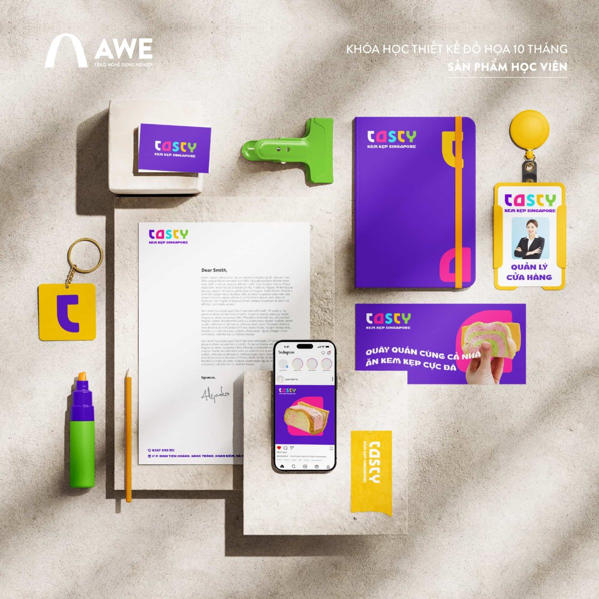 Trong suốt quá trình thực hiện, học viên được hướng dẫn xây dựng guideline thương hiệu, triển khai mockup thực tế, đồng thời ứng dụng công cụ AI để khám phá và mở rộng ý tưởng thiết kế.