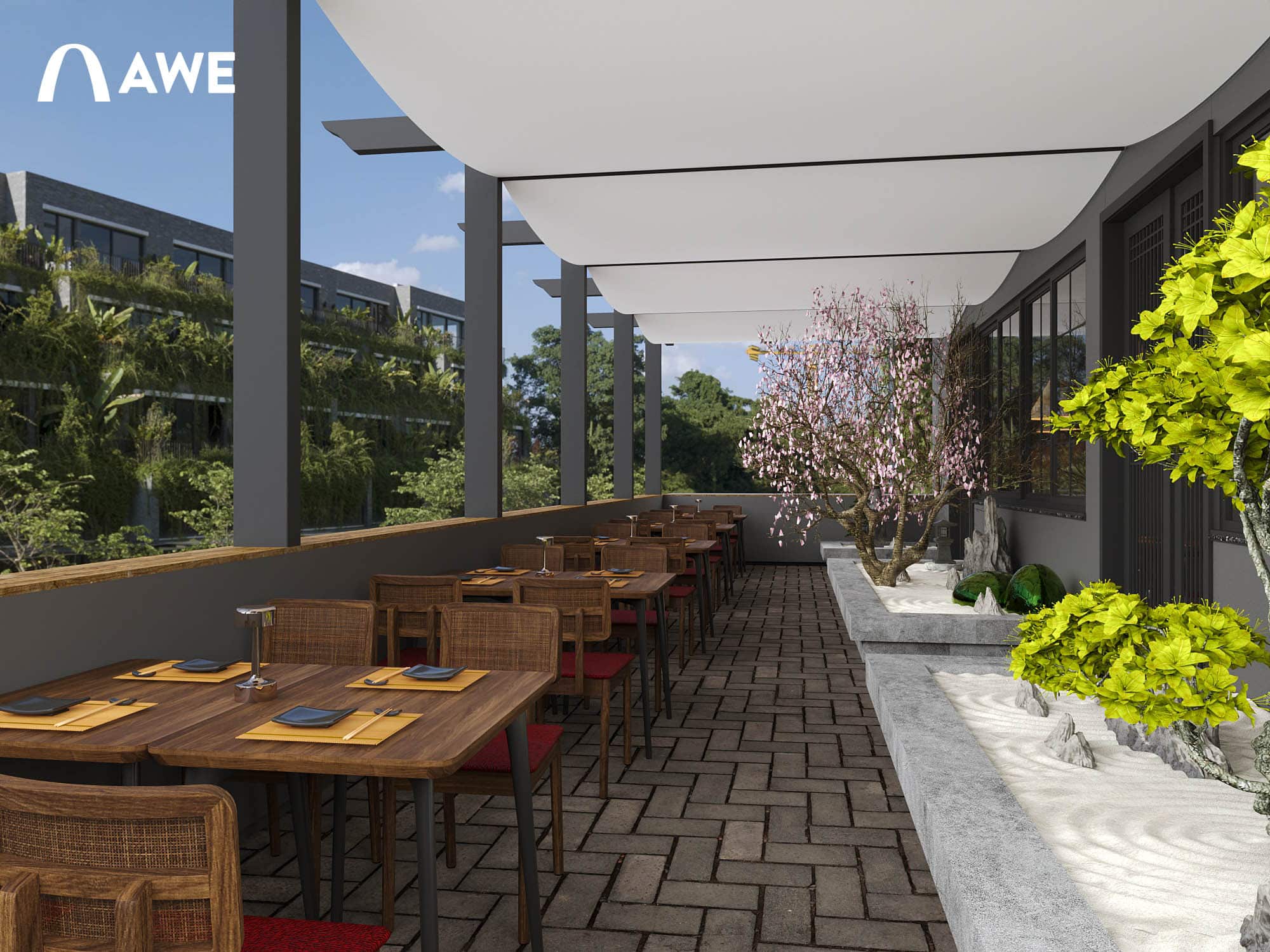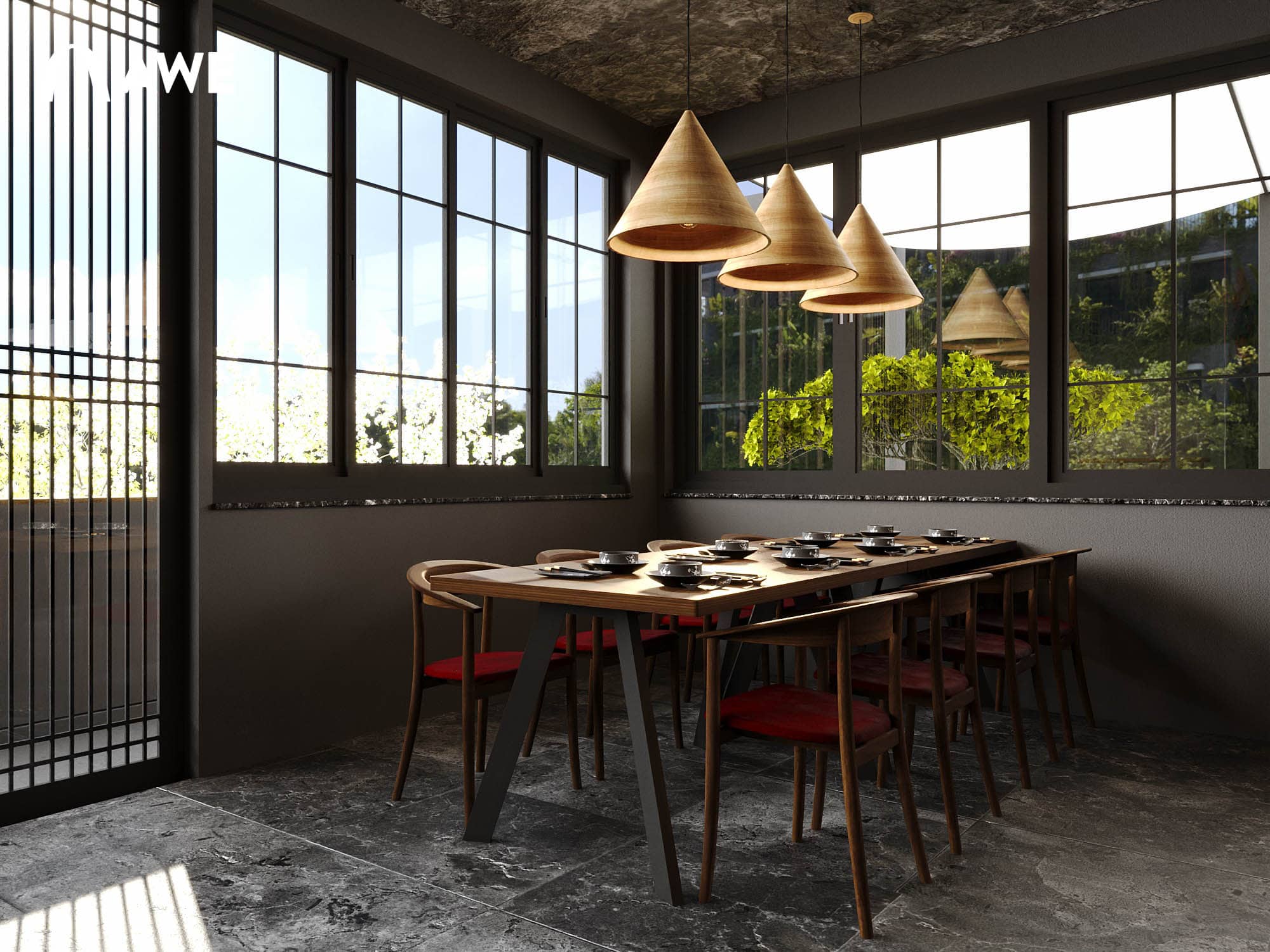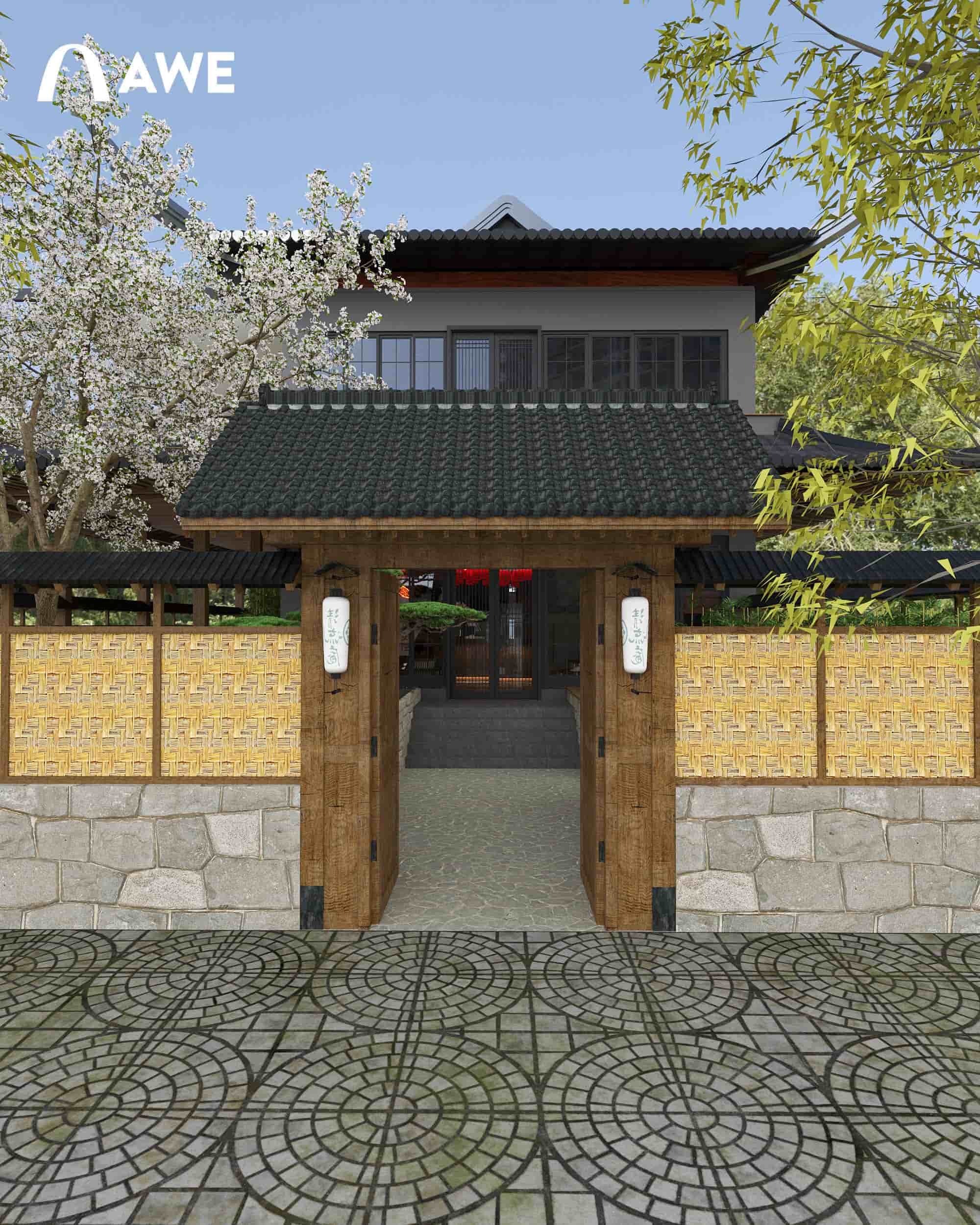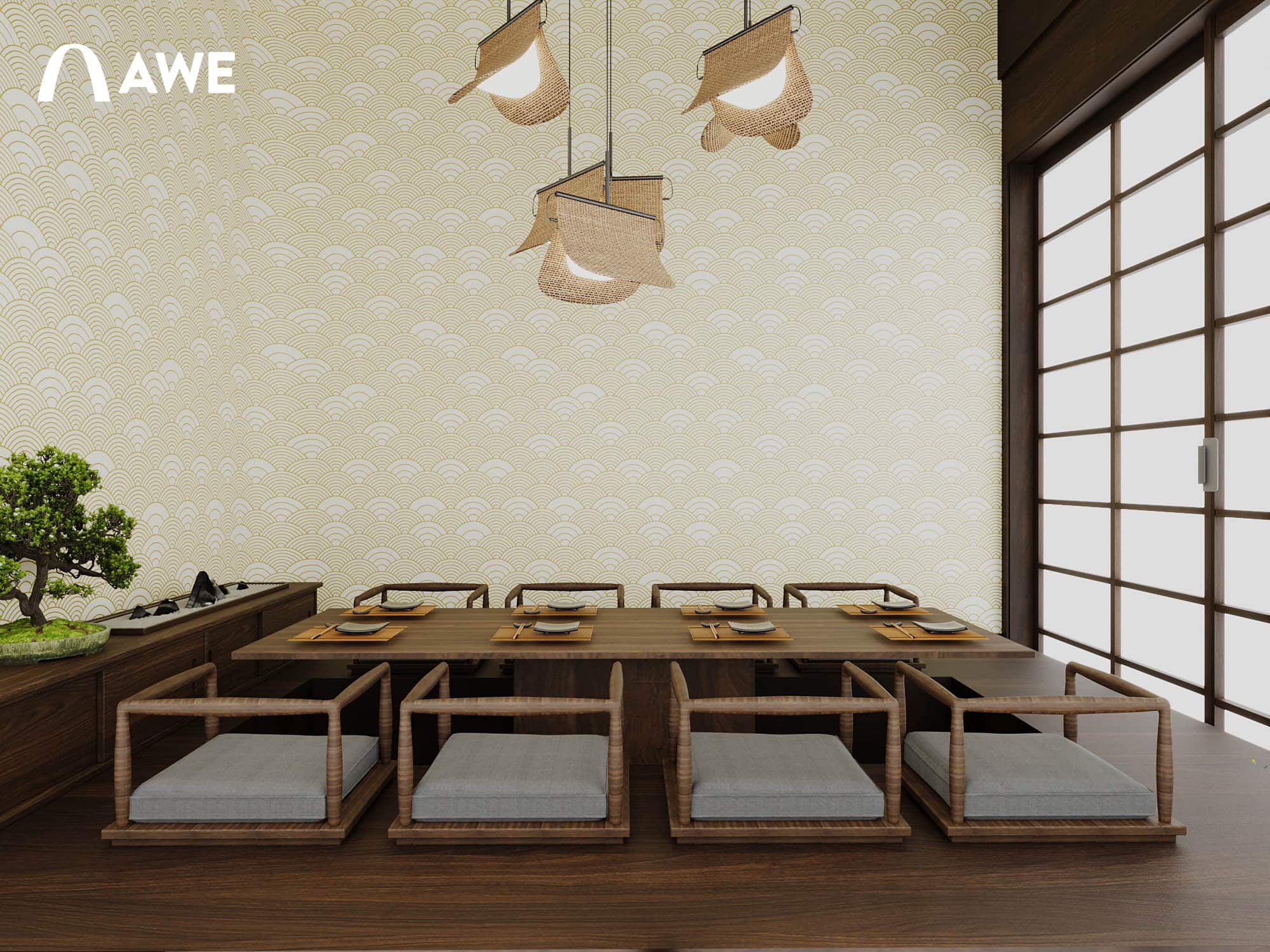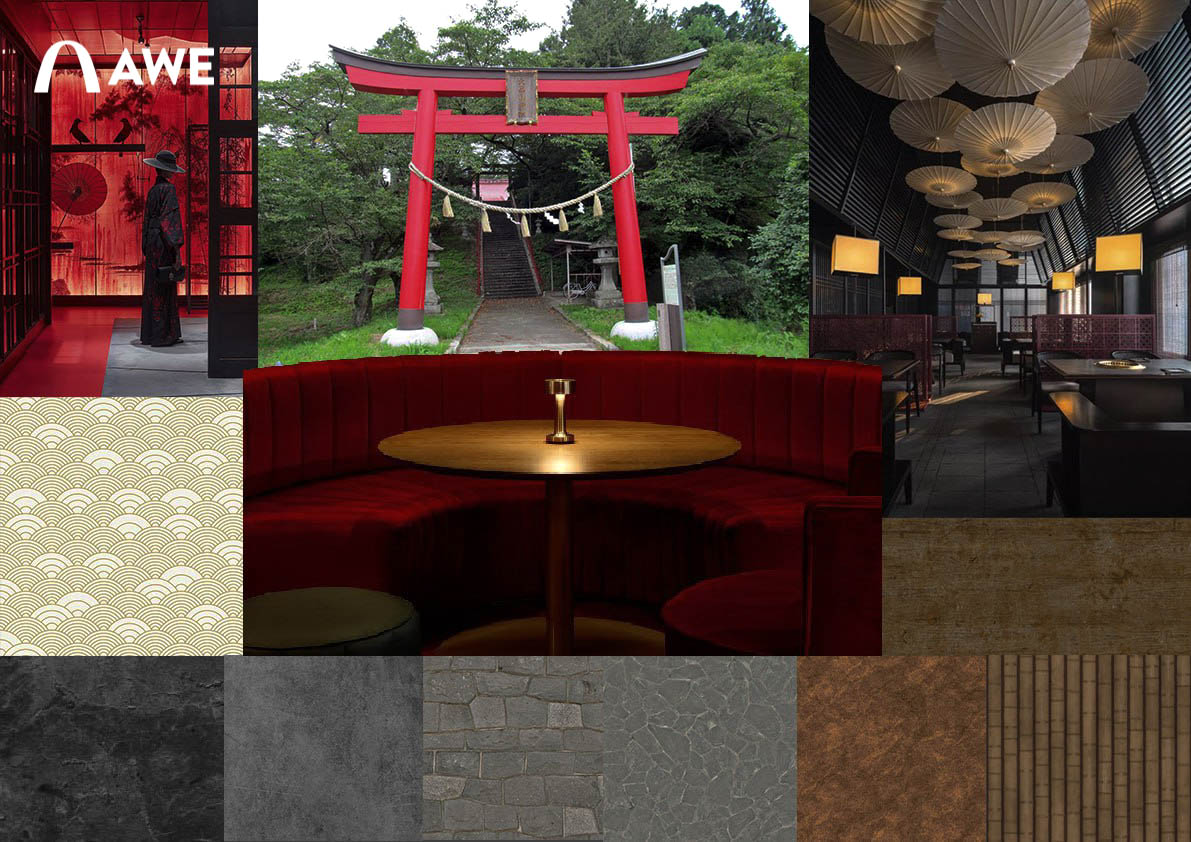 Thiết kế Nội thất nhà hàng Nhật của học viên Vũ Đức Mạnh sử dụng tông màu chủ đạo là ghi, xám, đỏ đây cũng là tông màu của cổng Torii – một loại cổng truyền thống của Nhật Bản, thường được dựng ở lối vào các đền thờ Thần đạo (Shinto). Kết hợp cùng những vật liệu thô mộc cùng với những họa tiết đặc trưng như vây cá, vân mây,.. tạo nên không gian đặc trưng đậm chất Nhật.
