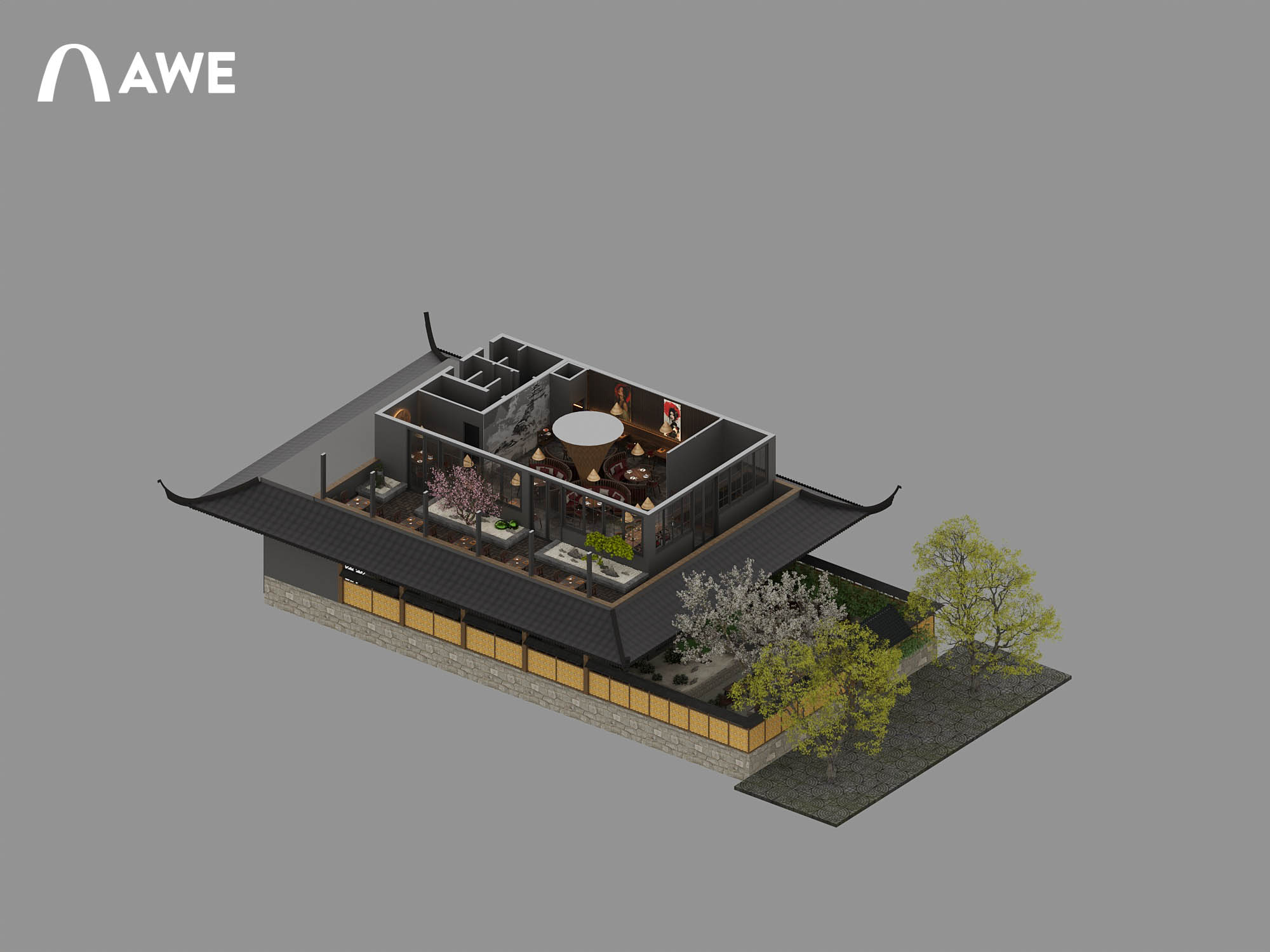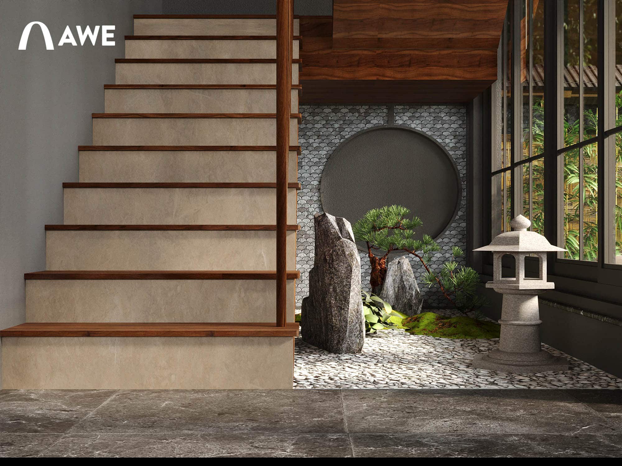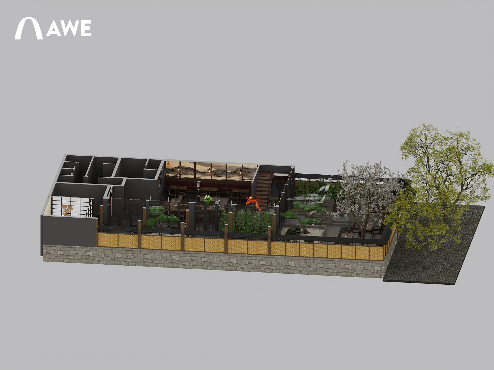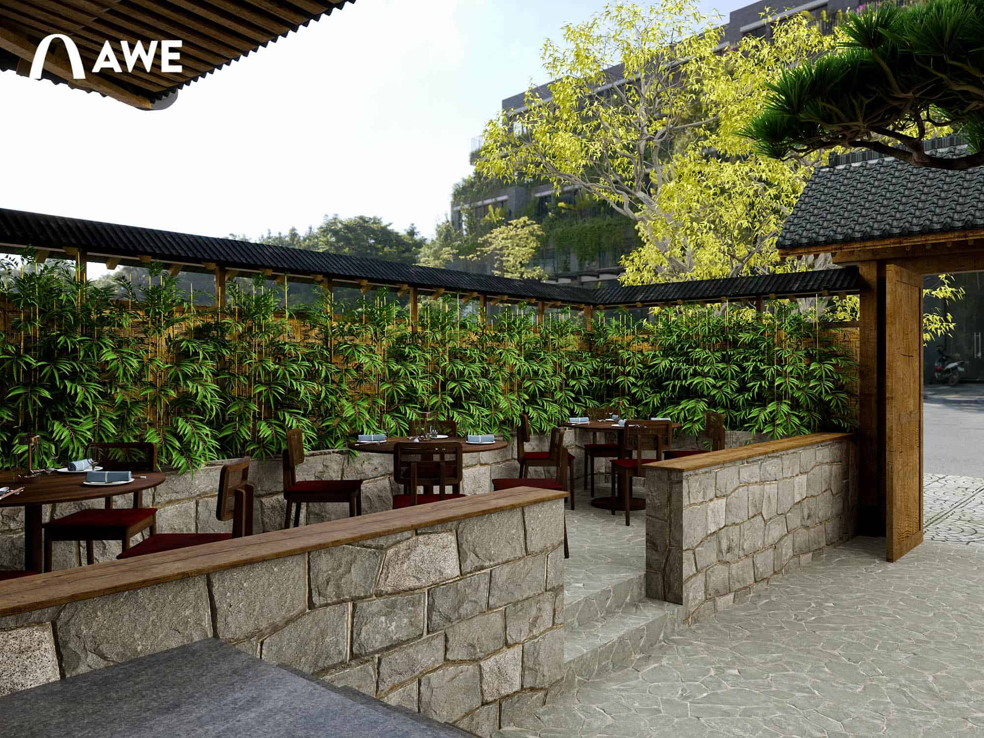Thiết kế Nội thất nhà hàng Nhật của học viên Vũ Đức Mạnh sử dụng tông màu chủ đạo là ghi, xám, đỏ đây cũng là tông màu của cổng Torii – một loại cổng truyền thống của Nhật Bản, thường được dựng ở lối vào các đền thờ Thần đạo (Shinto). Kết hợp cùng những vật liệu thô mộc cùng với những họa tiết đặc trưng như vây cá, vân mây,.. tạo nên không gian đặc trưng đậm chất Nhật.